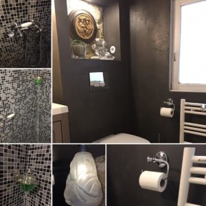 The look achieved surpasses our expectations. LED spot lights were added to the niche above the toilets and in the shower. polished concrete is framing parts of the stone wall we could keep visible when not structurally needed. A couple vintage art deco appliques were added to polish a retro-chic look. Other accessories were chosen to match the chosen theme: chrome shower head, soap dispenser and WC accessories. The white of the towel heater, toilets and bassin add a modern contrast to the shine of the chrome elements and dark grey of the polished concrete walls.