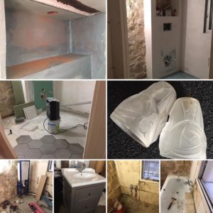 The whole bathroom was firstly out of date and starting to deteriorate rapidly: taps would come off the wall, shower curtain getting loose, … Also it was really not practical: tall people would need to seat sideways on the toilets and their head would touch the wooden beams while standing on the bathtub (floor to “ceiling” is 1m95). The basin was disproportioned compared to the use of it and mirror cabinet more than overused. also there was no storage besides the wardrobe.