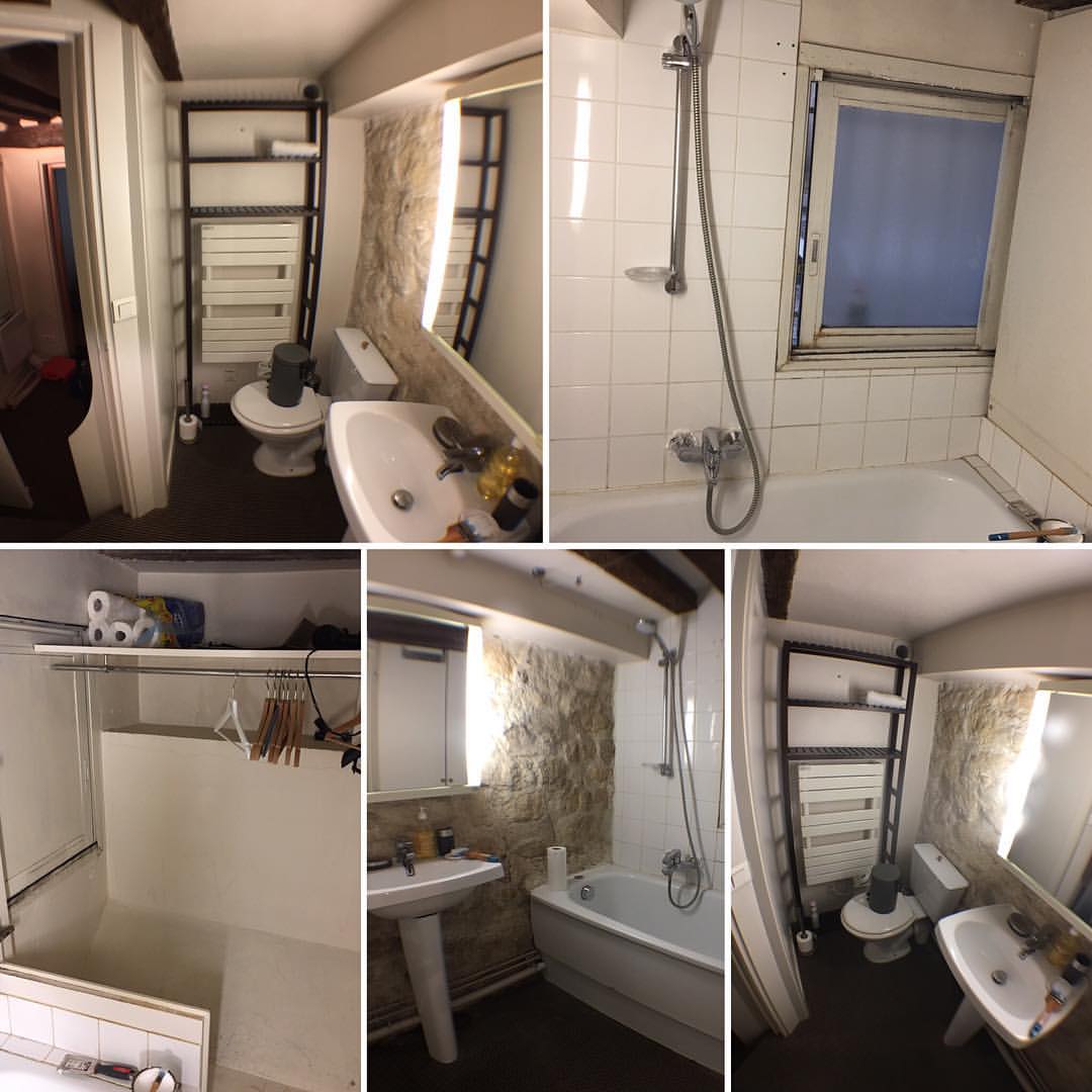 The whole bathroom was firstly out of date and starting to deteriorate rapidly: taps would come off the wall, shower curtain getting loose, … Also it was really not practical: tall people would need to seat sideways on the toilets and their head would touch the wooden beams while standing on the bathtub (floor to “ceiling” is 1m95). The basin was disproportioned compared to the use of it and mirror cabinet more than overused. also there was no storage besides the wardrobe.