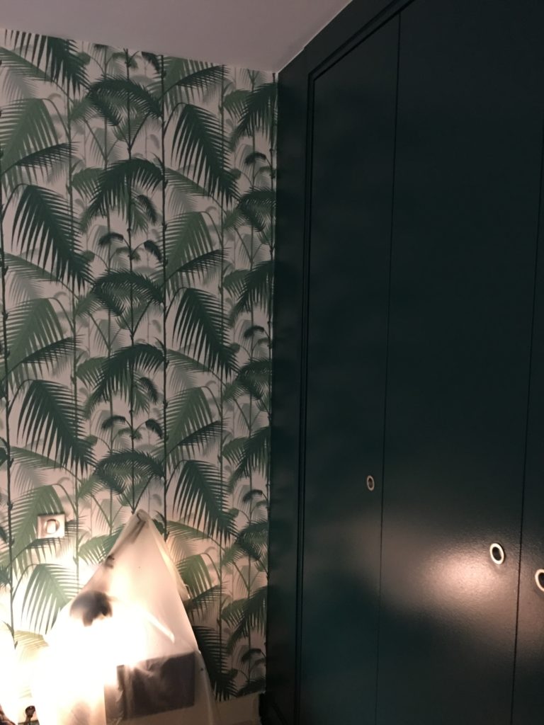 At first the dark green chosen for the bedroom was a bit of a fright for the clients, but they decided to follow the vision I had for the whole project. Doors of the dressing were painted and I decided to add the entrance to the bedroom as well in order to create an alcove and a little vestibule feel. It also helps make the room look more rectangular by visually erasing the dressing and creating a straight finish of the room. The starting element being the wallpaper that was already purchased, wall hang dressing tables were added and the bedding chosen to match the whole universe. New lights and lamp post were also chosen to finish it all off. After a couple nights to adjust, they now love the cocooning effect that this dark green adds to the bedroom.