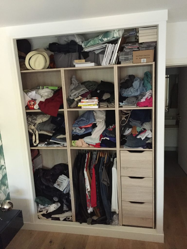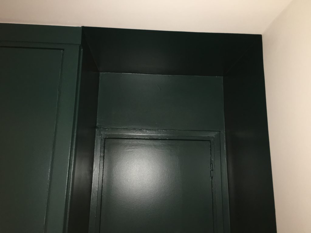 In the lounge, we chose a diagonal. It links the two main walls at its tip on the corner, follows to include the door and finishes on the ceiling of the kitchen. Clients were a bit hesitant at first, but some photoshop editing of their current lounge helped them visualise what the effect would be. We chose a light blue with a hint of grey to go with the existing mustard and grey furniture. Some more furniture was purchased and colours for the doors of the cabinet were especially chosen to finish up the universe. Other decorative elements were added on a vertical not to break furthermore the horizontality of the room.
