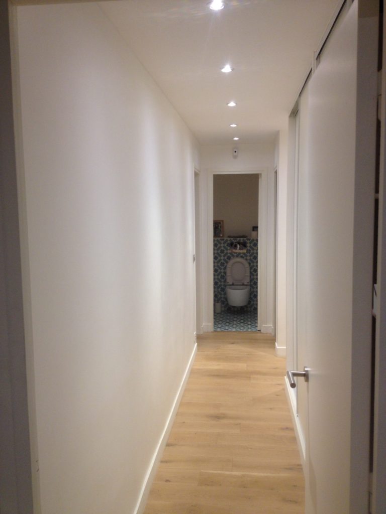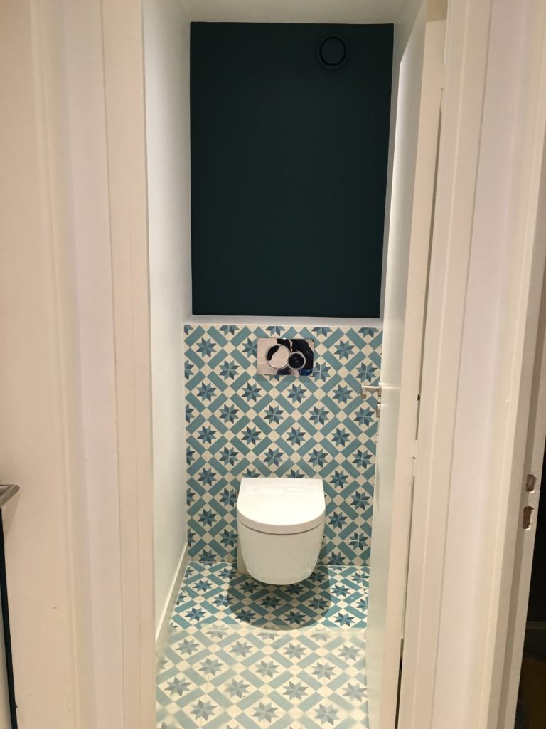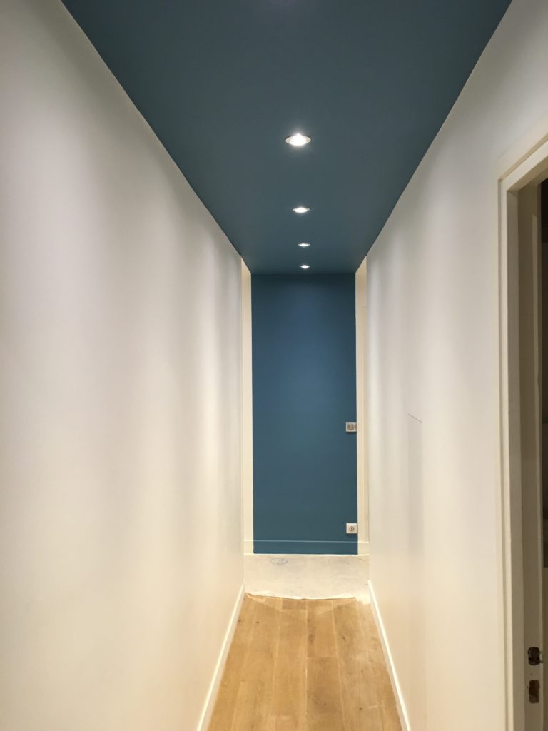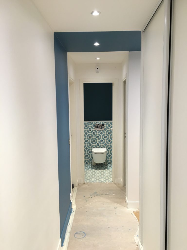 In the hallway, I decided to connect the corridor to the hallway by the ceiling. At the end of the corridor, the paint made a structural beam disappear and the prolongation of it on the hallway wall helps break the length of it. You will find it also frames the toilets when the door is open. The toilets tiles were actually the starting point to chose the color and it results in a striking effect. Once again, clients were a bit hesitant at first. “It’s only paint, we can always change it if we don’t like it”. They now love the way it interconnects the two spaces together and would not change it at all.